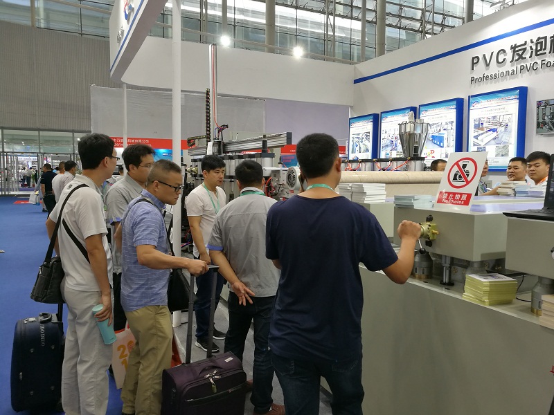 5.16-5.19,公司參加了在廣州舉行的2017CHINAPLAS國際橡塑展。展會期間,公司展出了產(chǎn)量600KG/H的PVC結(jié)皮發(fā)泡板生產(chǎn)線,吸引了大量客戶前來參觀和咨詢,設(shè)備在展會現(xiàn)場即被廣東客戶訂購。由于PVC發(fā)泡板應(yīng)用范圍廣泛,不僅可以用做家具板、裝飾板,還可以用來做廣告板和建筑模板,櫥柜和浴柜應(yīng)用的也比較多,很多相關(guān)行業(yè)的客戶表示了極大的興趣,并對設(shè)備的生產(chǎn)能力和技術(shù)工藝給予了極高的評價和充分肯定。